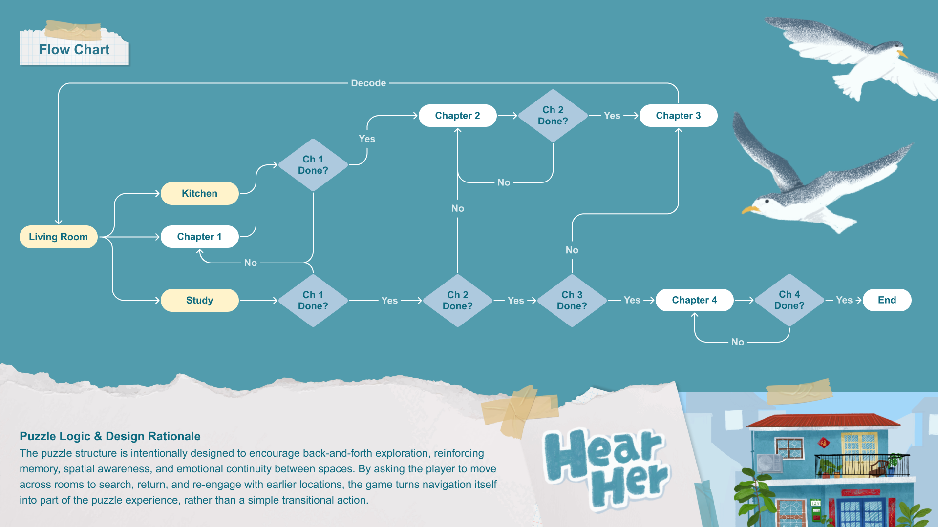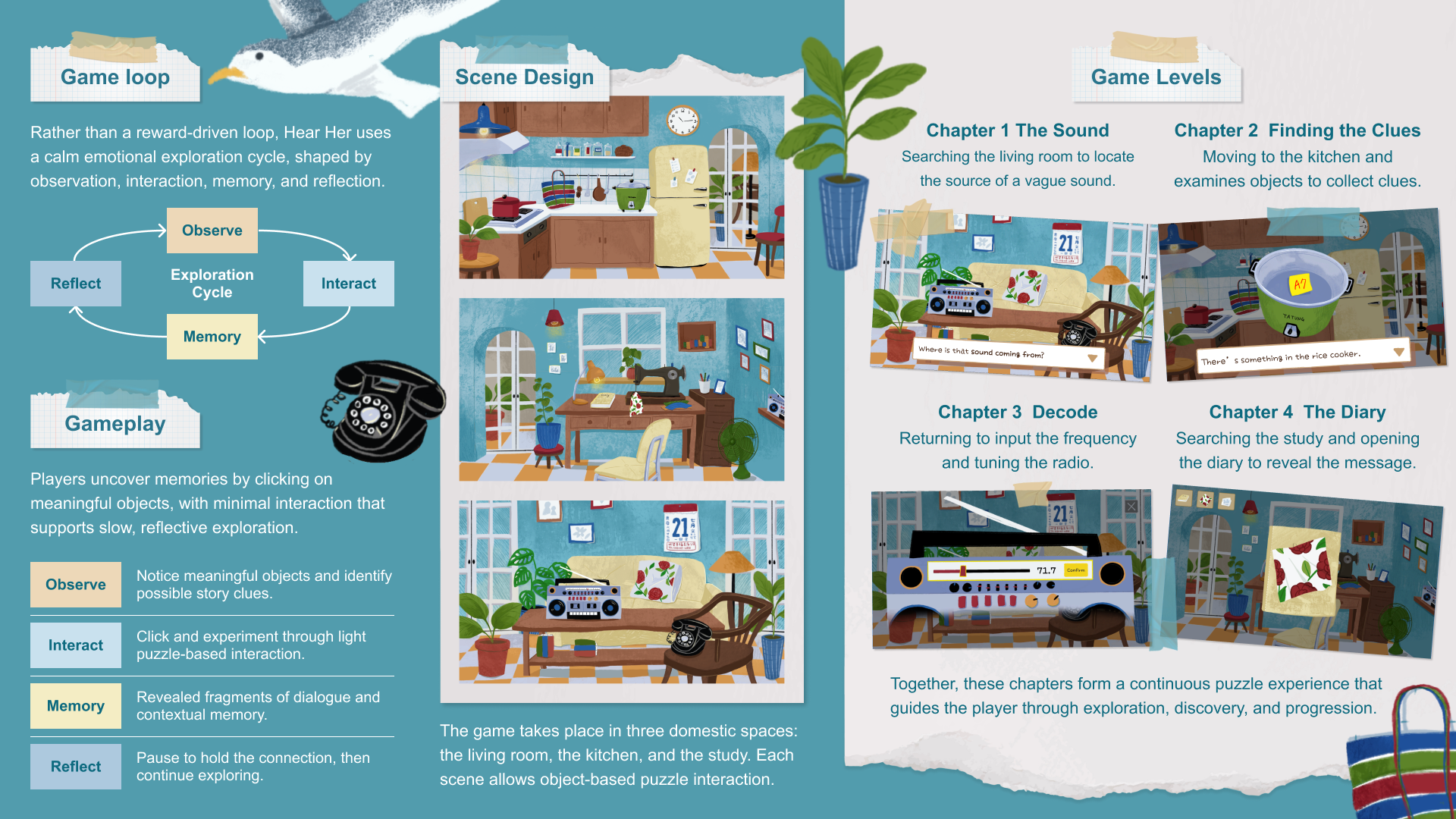 “Hear Her” is a short narrative puzzle game set inside a quiet home. You move through each room, interact with simple objects, and uncover small sounds and pages that guide the experience. The atmosphere is calm, and the interaction stays light and intuitive.